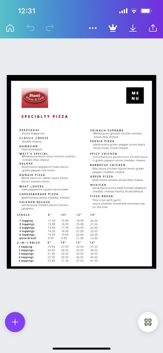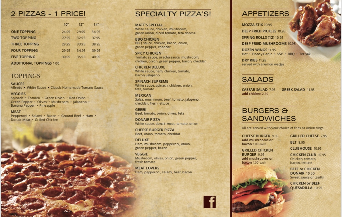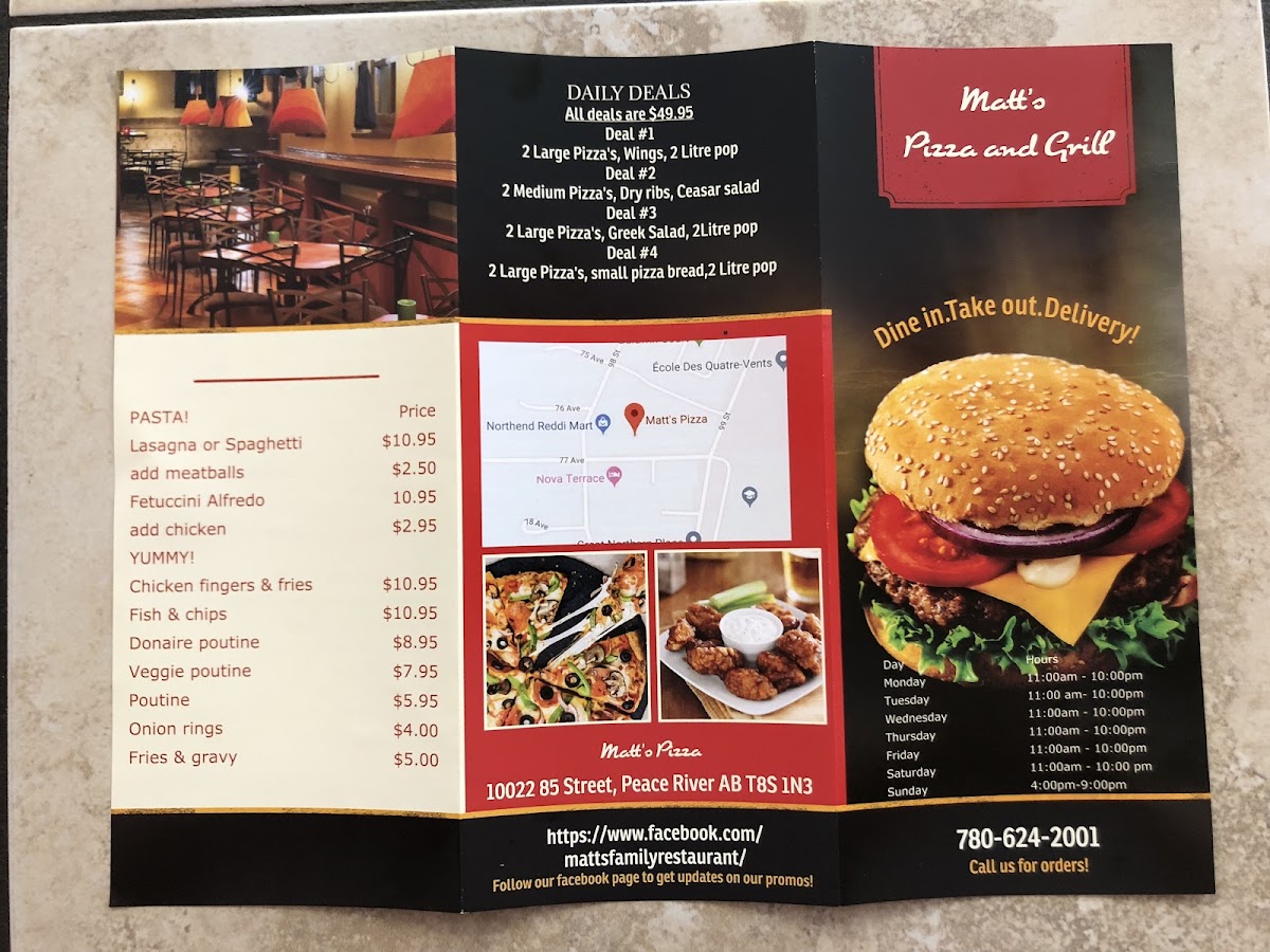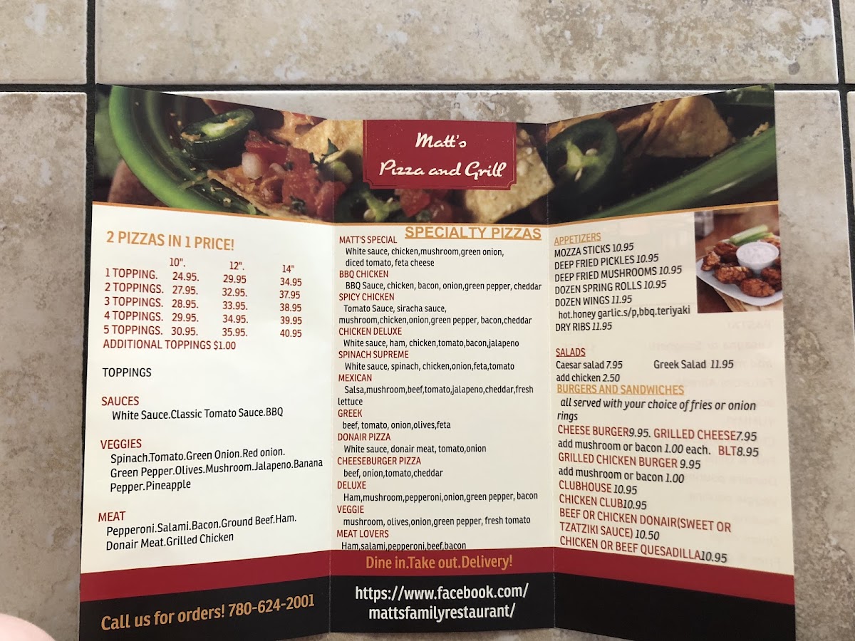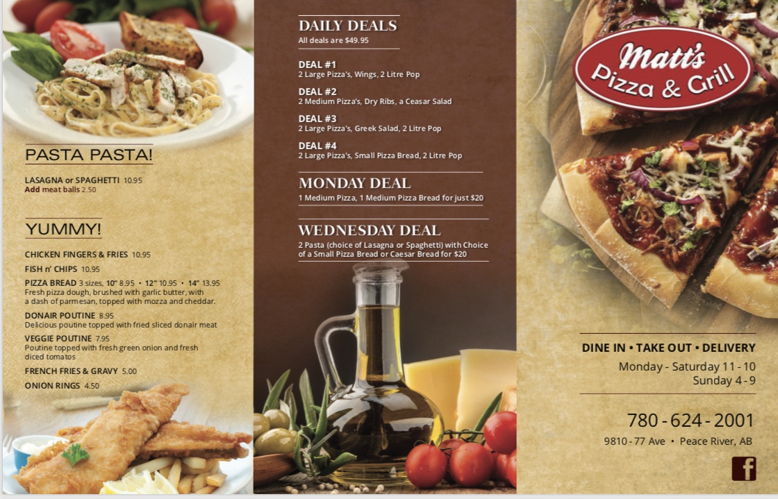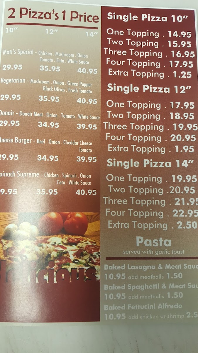 From a reviewer’s perspective, Matt’s Pizza at 9810 77 Ave in Peace River presents a straightforward, satisfying selection that caters to both classic pizza lovers and those craving hearty starters and mains. Standout items include the crowd‑pleasing Meat Lovers Pizza - CA$16.95, the classic Pepperoni Pizza - CA$12.95, and essentials like Chicken Wings - CA$12.95 and Mozzarella Sticks - CA$12.95, all reasonably priced for the portion sizes. For a heartier bite, fans seem to enjoy Chicken fingers and fries - CA$13.95, while those after rich, meaty flavours will appreciate the Dry Ribs - CA$12.95. The menu also features a range of other categories - from fries and salads to pasta, burgers/sandwiches (served with fries or onion rings), desserts, beverages, and sauces - though specific prices for these aren’t listed here. Overall, the menu balances familiar favourites with value‑driven pricing, making it easy to find something enjoyable whether you’re ordering a quick starter, a full pizza meal, or something in between.